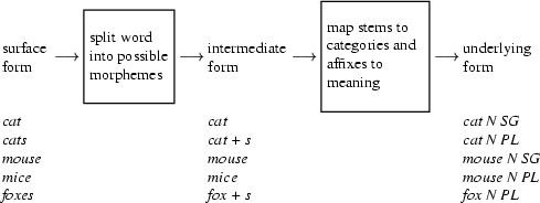 Here is a picture illustrating the two steps of our morphological parser with some examples.