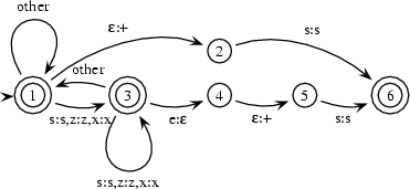 Now, consider the input berries. What will our cascaded transducers make out of it? The first one will return two possible splittings, berries and berrie + s, but the one that we would want, berry + s, is not one of them. The reason for this is that there is another spelling rule at work, here, which we haven't taken into account at all. This rule is saying that ``y changes to ie before s''. So, in the first step there may be more than one spelling rules that all have to be applied.