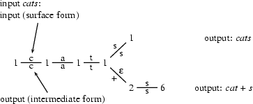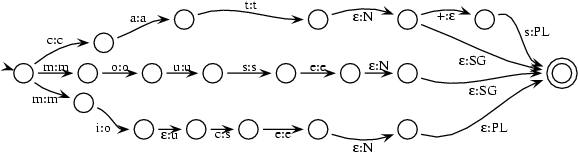 Plugging these (partial) transducers into the transducer given above we get a transducer that checks that input has the right form and adds category and numerus information.