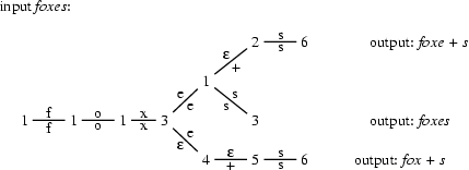 Let's see how this transducer deals with some of our examples. The following graphs show the possible sequences of states that the transducer can go through given the surface forms cats and foxes as input.