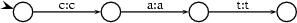 What still needs to be specified is how exactly the parts between state 1 and states 2,3, and 4 respectively look like. Here, we need to recognize noun stems and decide whether they are regular or not. We do this be encoding a lexicon in the following way. The transducer part that recognizes cat, for instance, looks like this: