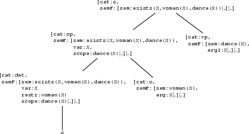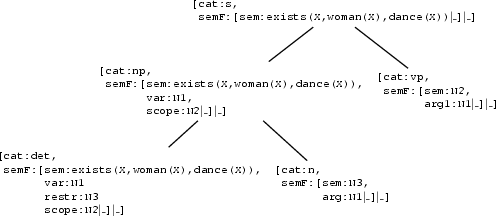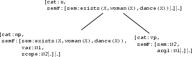[cat:s, semF:[sem:exists(X,woman(X),dance(X))|_]|_]The algorithm will use the s-rule of our grammar (reading it left to right) to expand the syntactic structure we are building in a top-down fashion. The rule also tells us that the semantic representation associated with the np is the same as the semantic representation associated with the s node. Note, however, that the semantics of the vp node is not yet instantiated, because we haven't found out yet what the inner structure of the np is. Once we know what is the scope of the np, we will also know what's the semantics of the vp.