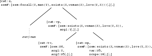 forall(Y,man(Y),exists(X,woman(X),love(Y,X))). The beginning is very much like in the previous example. After we have successfully generated the noun phrase every man, we are in the following situation: