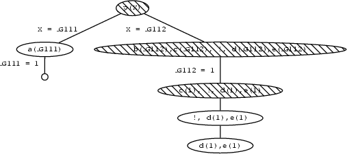 We then go on and look for a second solution. p(X) is matched with the second rule, so we get the new goals b(X),c(X),!,d(X),e(X). By instantiating X to 1, Prolog matches b(X) with the fact b(1), so we now have the goals c(1),!,d(1),e(1). But c(1) is in the database so this simplifies to !,d(1),e(1).